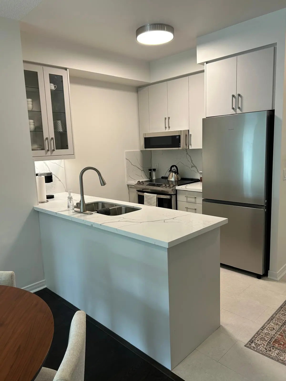 After: The finished kitchen now boasts custom cabinetry in a clean white finish, modern quartz countertops, a sleek backsplash, and updated lighting. The transformation not only brightened the space but also improved functionality and comfort.